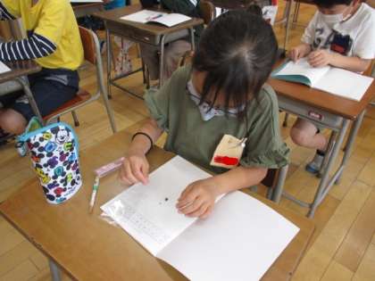 3年生の子供たちは、ヒマワリ・オクラ・ホウセンカ・ダイズの4種類の植物を育てています。自分が植えた植物以外の種を見て、「どの種も小さいね」「こんなに小さいのにどうやって大きくなっていくのかな」と、興味をもちながら種を観察しました。
