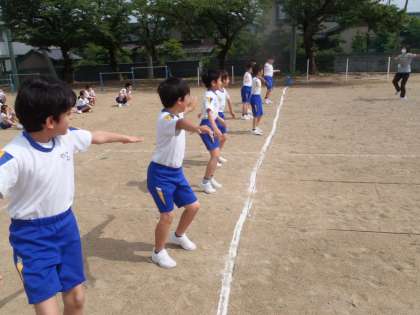 体育科の授業で短距離走をしました。走る運動の前に、足を高く上げたり、体の重心を深く落としたりする運動をすることで、普段使わないような筋肉も使って走ることができました。