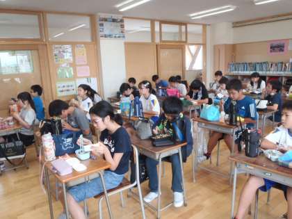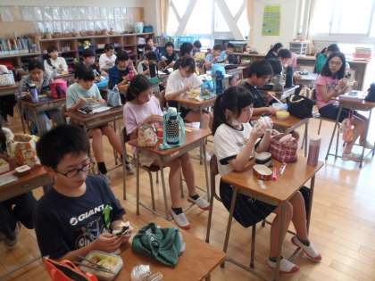 4限の学習後、子供たちは手を洗いながら「今日は最後のお弁当だ」と話し、昼食の準備に向かいました。子供たちは、毎日お弁当の時間を楽しみにし、うれしそうに食べていました。家庭科の学習で、一食分の献立を自分たちで考え始めた子供たち。献立を考えるのも調理するのもかなり大変なことだと知って、毎日メニューを考え、作ってくださるおうちの方に感謝する言葉が聞こえてきました。これまで毎日お弁当を準備していただき、本当にありがとうございました。