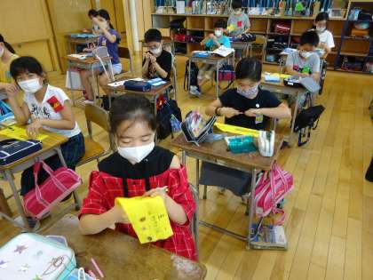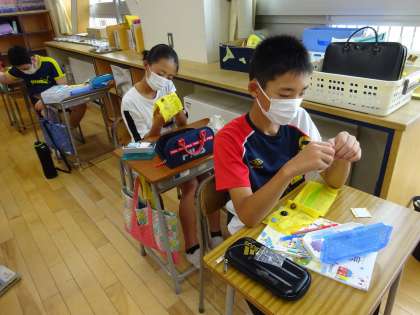 家庭科の学習で、ボタンの縫い付けの練習をしました。家から持ってきたボタンを上手に縫い付けることができました。また、早く縫い付け終えた人は、波縫いの練習をしたり模様や文字を縫ったりするなど、意欲的に取り組む姿が見られました。