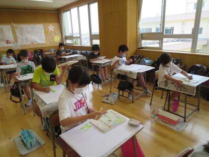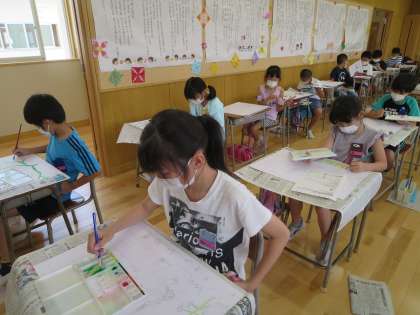 不思議な種から出てくる花は、この世に2つとないまぼろしの花。一人一人がイメージを膨らませて、画用紙いっぱいに咲かせました。形や色を工夫しながら、細かいところまで丁寧に描く子供たちの姿を見ると、作品の出来上がりが楽しみです。