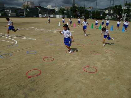 今日は、体育の学習で、ケンステップや川を跳び越えるコースを使って運動しました。高く飛んだり、細かく飛んだりするなど強弱を付けて「跳ぶ」運動を頑張りました。