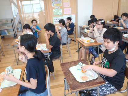 毎日の給食時間には、放送で曲が流れています。今週は、「木星」や「ラプソディー・イン・ブルー」が流れ、「この前の音楽の時間に聴いた曲だね」「5年生の音楽会の時に演奏したね。懐かしい」等とささやく声が聞かれたり、リズムに乗って体を揺らす姿が見られたりしました。曲を聴きながら、笑顔で給食をいただいています。