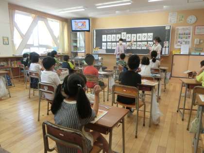 子供たちは、繰り返し数を唱えたり、「five」だけ手拍子を打ったりして、楽しみながら数の表現に慣れ親しんでいました。学習した内容を活かしていろいろな物を数える活動では、積極的に英語表現を使う姿が見られました。