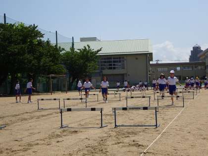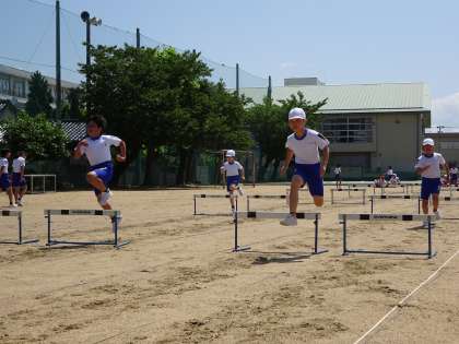 今日は、最後のハードル走を行いました。50mの間に置かれた5台のハードルを越えていきます。今まで練習してきた「スピードに乗って跳ぶ」「リズミカルに走り抜ける」ことを意識して、元気に取り組んだ子供たちでした。