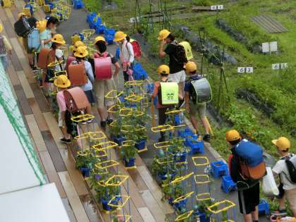 どうしたのだろうとベランダから様子を見てみると、登校してきた3・5年生が、一生懸命、昨夜の強風で倒れた1・2年生のプランターを立て直しているではありませんか。