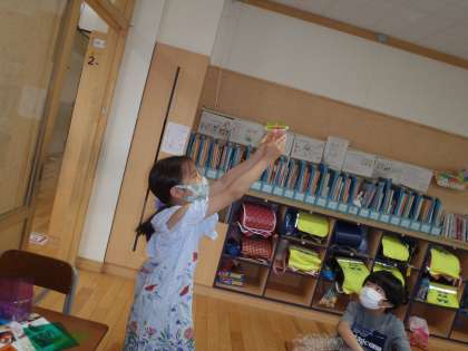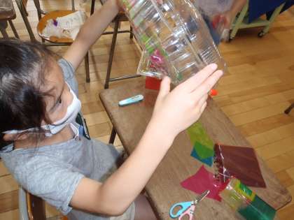 今日は、図画工作科の授業で「ひかりのプレゼント」という学習に取り組みました。いろいろな色のセロハンを使って色の組合せや重なりを楽しんだり、光の量や当て方を試したりして学習を進めました。子供たちは、たくさんすてきな「プレゼント」を見付けていました。