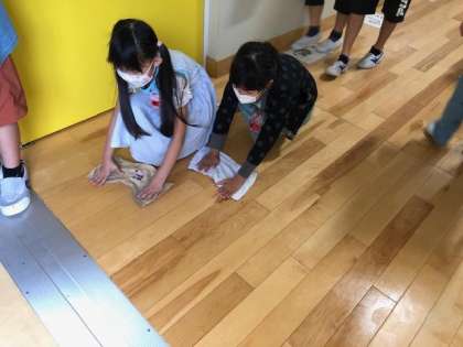 梅雨の時期に入り、雨が降っていることが多くなりました。雨で濡れてしまった玄関や廊下の拭き掃除をする5年生の姿を見て、3年生も「みんなのために働きたい」と考えました。登校してすぐにランドセルを片付け、5年生と一緒に掃除に取り組んでいます。
