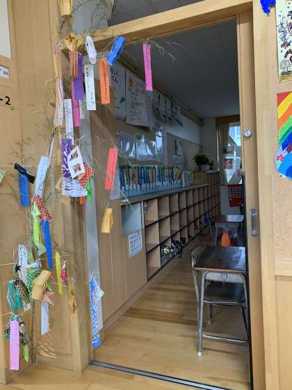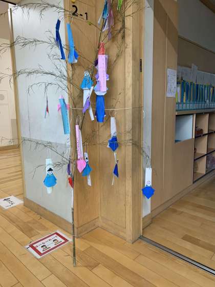 7月7日(火)、子供たちは、願い事を短冊に書いたり七夕飾りをつくったりしました。また、七夕集会や読み聞かせを通して、七夕の由来や伝説について知りました。
