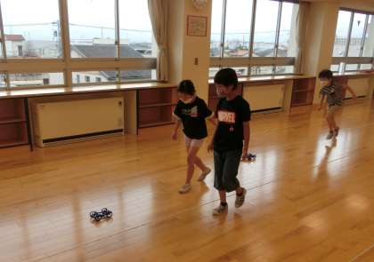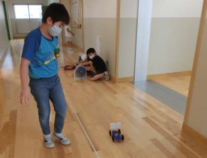 実験を進めていくと、あちこちで「すごい!!」という声が聞こえてきます。風の強さやゴムの伸ばし方によって、車が10メートル以上も進むのです。風やゴムの力を目の当たりにした子供たちは大興奮。本当にそれほど進むのかを確かめたくて、何度も実験を行っていました。
