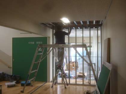 南館玄関前にある石碑や銅像の移動作業、南館と中央館を結ぶ2階廊下に間仕切りの設置作業が行われました。