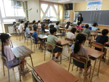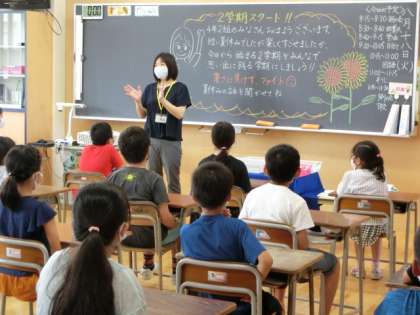 子供たちは、登校時は久しぶりに先生や友達に会えたうれしさで笑顔が見られましたが、校長先生のお話が始まると気を引き締め、姿勢を正してしっかりと聞いていました。 始業式後、各教室では子供たちが夏休み中のことを話したり、担任が2学期のこれからのことについて話したりしました。