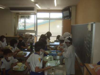 給食当番の子供たちは手洗いをしっかりと行い、エプロンを着用して配食しました。