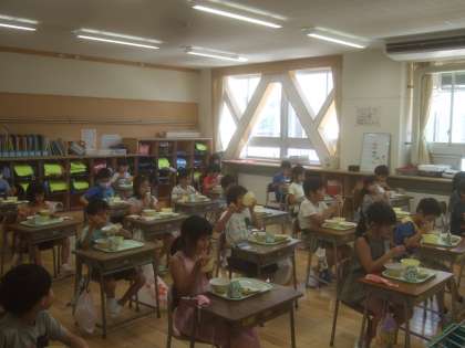 子供たちは、昼の放送を聞きながら、話しをせず、久しぶりの給食をおいしく味わっていただきました。