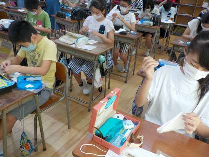 家庭科の学習でマスクづくりに取り組みました。久しぶりの裁縫だった子供も多いようでしたが、マスクづくりが始まると、だんだんと手慣れた様子で縫っていくことができました。真っ直ぐ縫うことや細かく縫うこと等、大変だったこともありましたが、完成したマスクを試着し、にっこり笑顔な子供たちでした。