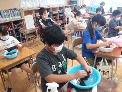 「靴下の外側と内側どちらにも汚れがあることが分かったので、裏返して両側を洗うことも必要だと思った」や「結構大変だったので、これまでお母さんに任せきりだったけれど、これからは自分のマスクや汚れた服等の手洗いは自分で進んで取り組みたい」等、実際に行ってみることで考えたことが多くあった子供たちでした。
