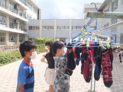 これまでの学習で、ほこりや砂等の目に見える汚れもあれば、汗や油等の目に見えない汚れもあることを学びました。今回手洗いでの洗濯をし、洗った後の水が少し黒っぽくなっていたり、ごみが浮いていたりしたのを見て、目に見える汚れも目に見えない汚れもあることを実感していました。