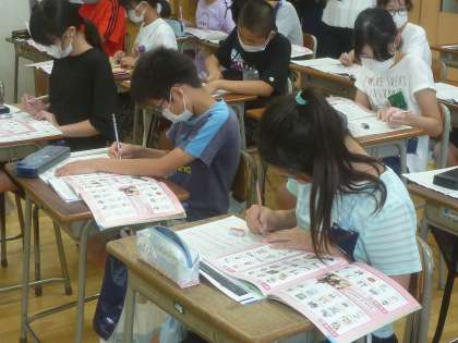 6年生は、外国語科の学習で、日本の夏の過ごし方をイギリスにいるALTのおばあさんに伝えるために、自分の夏休みの出来事を絵日記にまとめています。