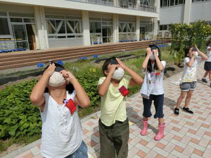 普段直視することのない太陽を初めて観察した子供たちは大喜びです。休み時間に教室の窓から太陽を見る子供もいました。