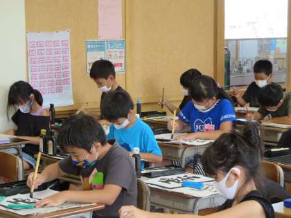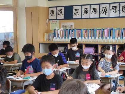 筆順と字形に気を付けながら「左右」を書きました。一画目に書く線が短くなるよう、一画一画お手本を見ながら真剣に書くことができました。静かに落ち着いて筆を動かす姿は、凜としていてとても格好よかったです。
