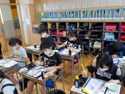 図画工作科の学習では、水墨画に取り組みました。墨一色を使い「濃い、薄い」や「かすれ、にじみ」を組み合わせながら作品づくりをしました。一人一人が描きたいイメージに合わせて筆を進めていくことができました。