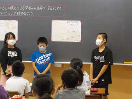 理科の学習で、地震や火山の噴火によってどのような災害が起こるのかを学びました。そして、災害から自分の命を守るために自分たちにできることは何かを調べ、まとめました。