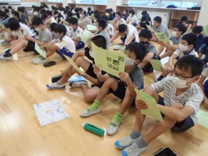 10月12日(月)の校外学習に向けて、学年で集まり、しおりを見ながら日程や持ち物について確認しました。