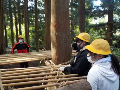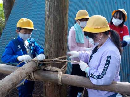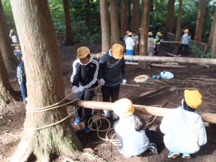 子供たちは、グループで協力して丸太を運んだり、荒縄を結んだりして、活動に取り組んでいました。活動中は「一緒に運ぼう」と声をかけたり、「荒縄を結ぶのを自分がするから、そっちの方をよろしく」と役割分担をしたりする姿が見られました。