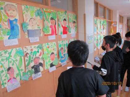 図画工作科では、マーメード紙いっぱいに描いた自分とヘチマの絵の鑑賞をしました。自分の作品にはない、友達の絵ならではの構図や色の使い方に注目して、一人一人の作品のよさを味わいました。