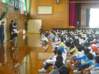 第1理科室より出火という想定で行い、グラウンドの状態がよくなかったため、全校児童は体育館に避難しました。