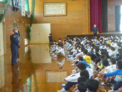 子供たちは「お・は・し・も」をしっかり守り、また、避難後の講評や中分署副署長さんのお話を静かに聞くことができていました。そのような態度が身に付いているからこそ、何か起きたときに自分の命を守ることができると思います。