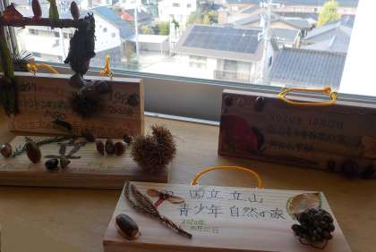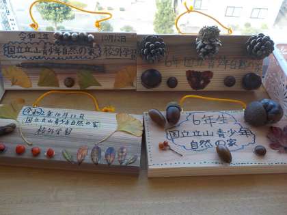 子供たちは「立山を木の実で表したいな」「トントンの森が印象に残っているから、トントンの森の入口をつくってみたよ」等と校外学習のことを思い出しながら作品づくりに取り組んでいました。秋の実の使い方を工夫し、自分だけのオリジナルのクラフトをつくることができました。