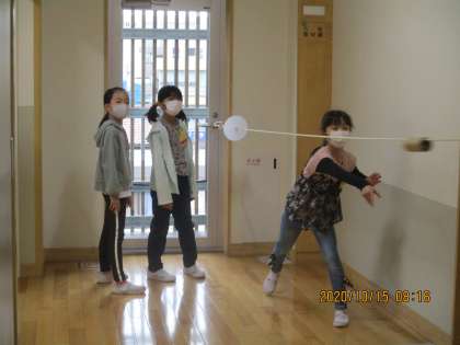 体育科で取り組んでいる「セストボール」のパスをもっとレベルアップするために、4年生教室前廊下にロープと段ボールの筒を使った練習エリアができました。子供たちは、筒をできるだけ遠くに、速く飛ばしたいと休み時間に楽しそうに取り組んでいます。