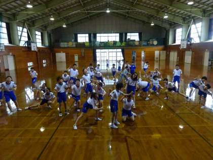 表現運動の学習の時間には、毎回一つのお題を決めて、全員で体全体を使って表現しています。今日のお題は「恐竜」と「クラゲ」です。表現運動の学習を始めたばかりの頃は動きが固かったですが、今ではここまで豊かに表現できるようになりました。