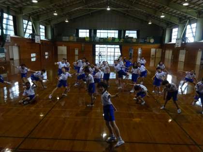 表現運動の学習の時間には、毎回一つのお題を決めて、全員で体全体を使って表現しています。今日のお題は「恐竜」と「クラゲ」です。表現運動の学習を始めたばかりの頃は動きが固かったですが、今ではここまで豊かに表現できるようになりました。