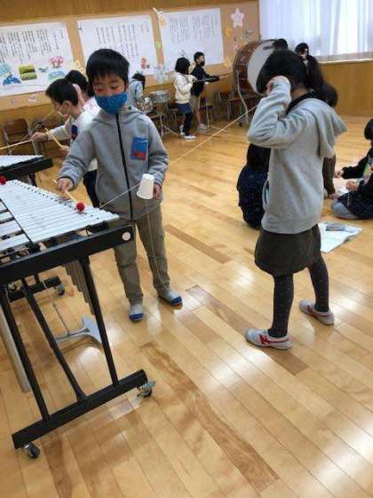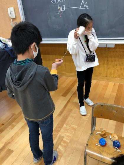 「片方の紙コップを楽器に変えても音は伝わるのかな?」と問いかけると、「どうかな?」「試したい」という声がたくさん聞かれました。ペアと協力しながら、「音が聞こえるか」「聞こえるときの糸の様子はどうかな」等、実験に真剣に取り組みました。
