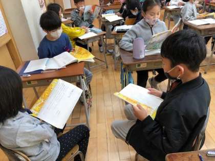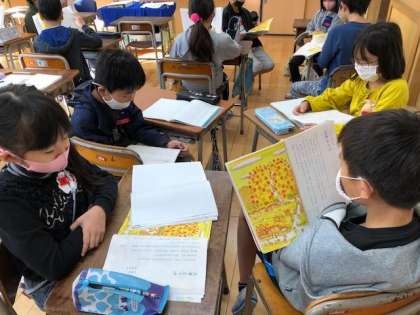 民話「三年とうげ」を勉強しています。「つつじやすみれがたくさん咲いているから、きれいな山だと思うな」「トルトリが来るまでは、みんな三年峠を怖がっていたと思うよ」等、文章から情景や登場人物の心情を読み取っています。