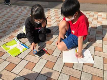虫眼鏡を使うと、日光を集めることができるか、実験しました。日光が当たったところは、明るく、温かく(熱く)なり、「日光を集めたところを小さく細くすると、煙が出たよ」「小さく細くすればするほど、明るくなるよ」等、実験結果から様々なことに気付きました。