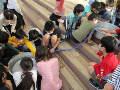 4年生は、社会科で「谷に囲まれた台地に水を引く」の学習をしています。椎名道三によって170年以上前につくられた黒部市の十二貫野用水について調べ、サイフォンの仕組みを使って水を送っていることを学びました。