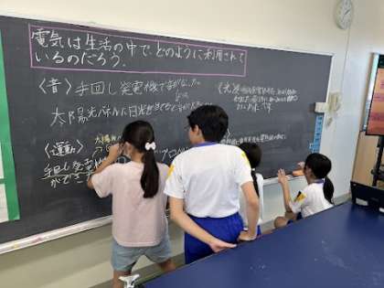 今日は理科の学習で電気が生活の中でどのように利用されているか考えました。子供たちは、自分の実験にじっくり取り組んだり、友達の実験から考えを深めたりしながら、学習に取り組みました。