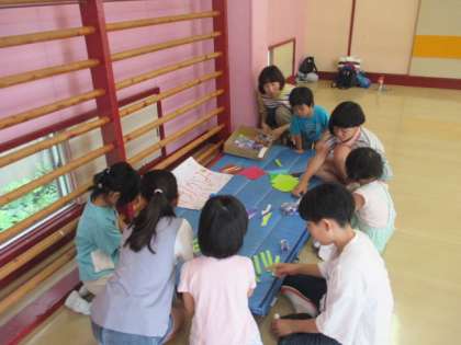 幼稚園・保育園を訪問し、園児のみなさんと交流させていただきました。想定通りにうまくいったこともあれば、改善が必要なこともありました。同じグループの友達と振り返りをしたことで、第2回目の訪問に向けて、さらにやる気を高めた子供たちでした。