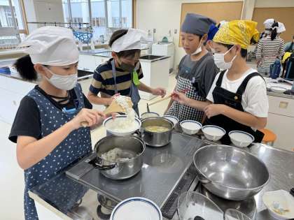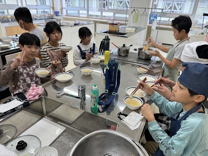 今日は、ご飯と味噌汁の調理に挑戦しました。ご飯では火加減、味噌汁では具を入れるタイミングに気を付けながら調理を行いました。グループで役割を分担し、声をかけ合いながら計画通りに進めようとする子供たちでした。