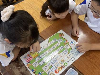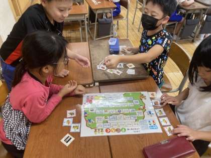 今日は栄養教諭の先生に富山でとれる食べ物や地域の食べ物のよさについて教えていただきました。すごろくで楽しみながら、富山の食材について考える姿が見られました。