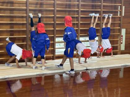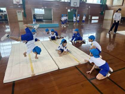 体育科の「ころ・ぴたっ・ぐっ・ぴょん マットシティ」の学習では、子供たち一人一人が練習場所を選択し、様々な動きを楽しみました。子供たちは、「マットをぐっと押すとうまくいくよ」とアドバイスしたり、「手は肋木に近づけていくと、足を高くあげられるんだね」と友達の動きからこつを見つけたりしていました。