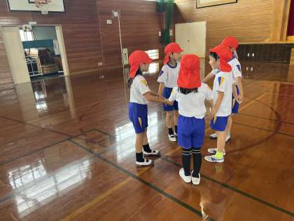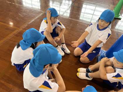体育科では、遊園地の遊具になりきって、表現する学習をしています。グループで話し合いながら、動きを考えています。