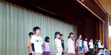 学習発表会の練習を体育館で行っています。声だけで伝える難しさを感じながらも、一生懸命取り組んでいます。