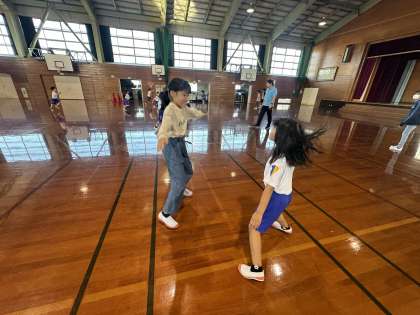今日の朝のチャレンジ運動はダンスでした。音楽に合わせて、ペアの友達の動きを真似しながら運動を楽しみました。