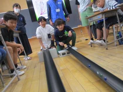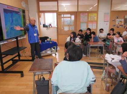 立山黒部ジオパーク協会の専門員の方を招き、富山の川や地形の特徴について学習しました。模型を使って川の流れの速さを比べたり、映像を見たりすることで、流れる水のはたらきについて理解を深めることができました。