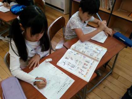生活科では、おもちゃづくりの学習が始まりました。今日は、どんなおもちゃを作るかについて考え、設計図を書きました。