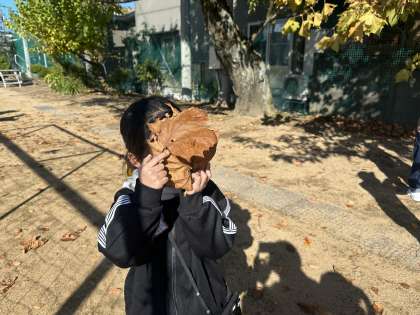 今日はグラウンドで秋見付けを行いました。自分の顔よりも大きな葉っぱを拾ったり、踏んだときにする面白い音に耳をすませたりと楽しみながら秋を見付けました。